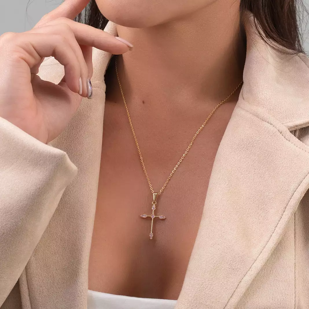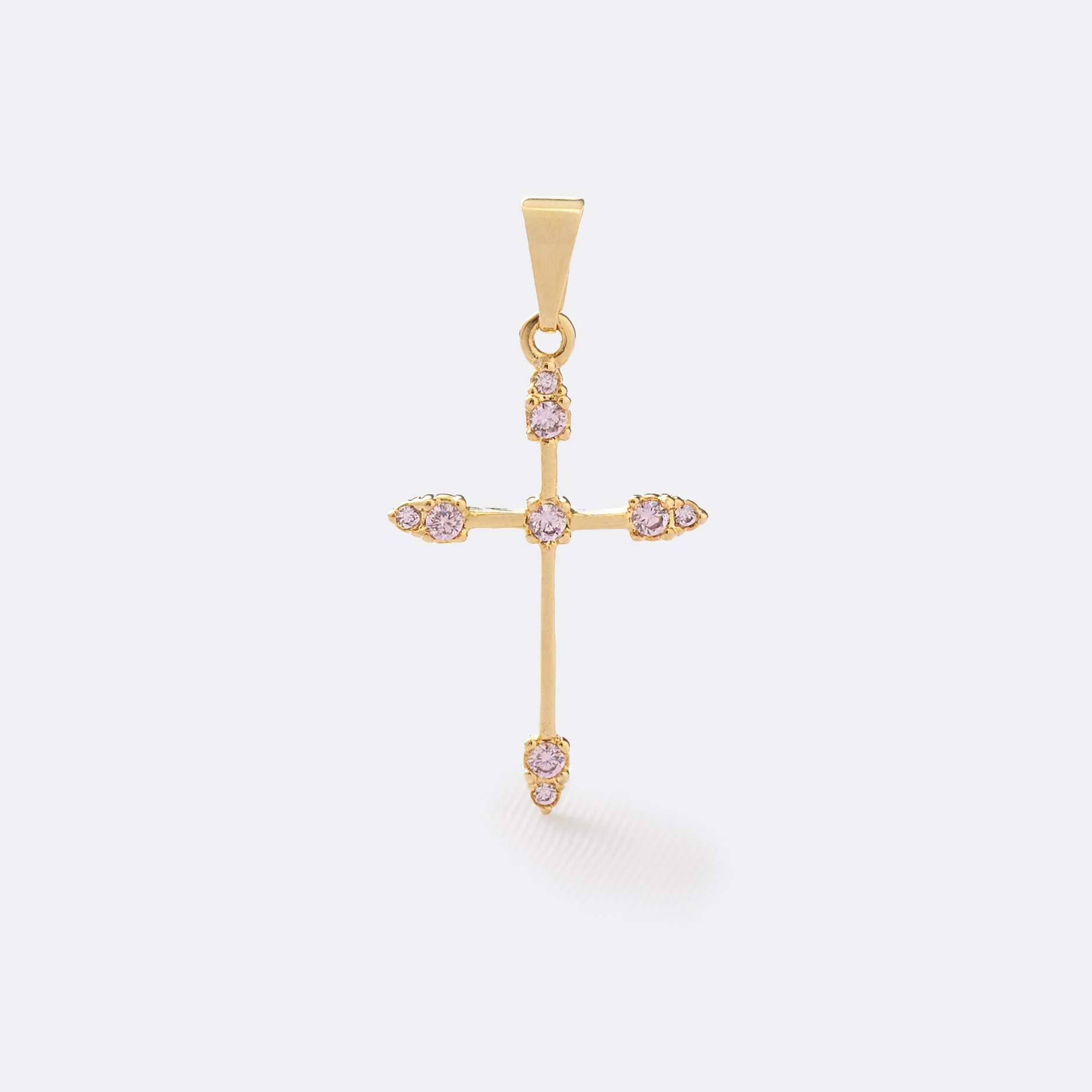Este moderno dije en forma de cruz tubular es una mezcla perfecta de espiritualidad y sofisticación. Con 9 circonias rosadas engarzadas, el diseño minimalista destaca por su delicadeza y brillo, mientras que el oro laminado 18K le aporta una durabilidad excepcional.
