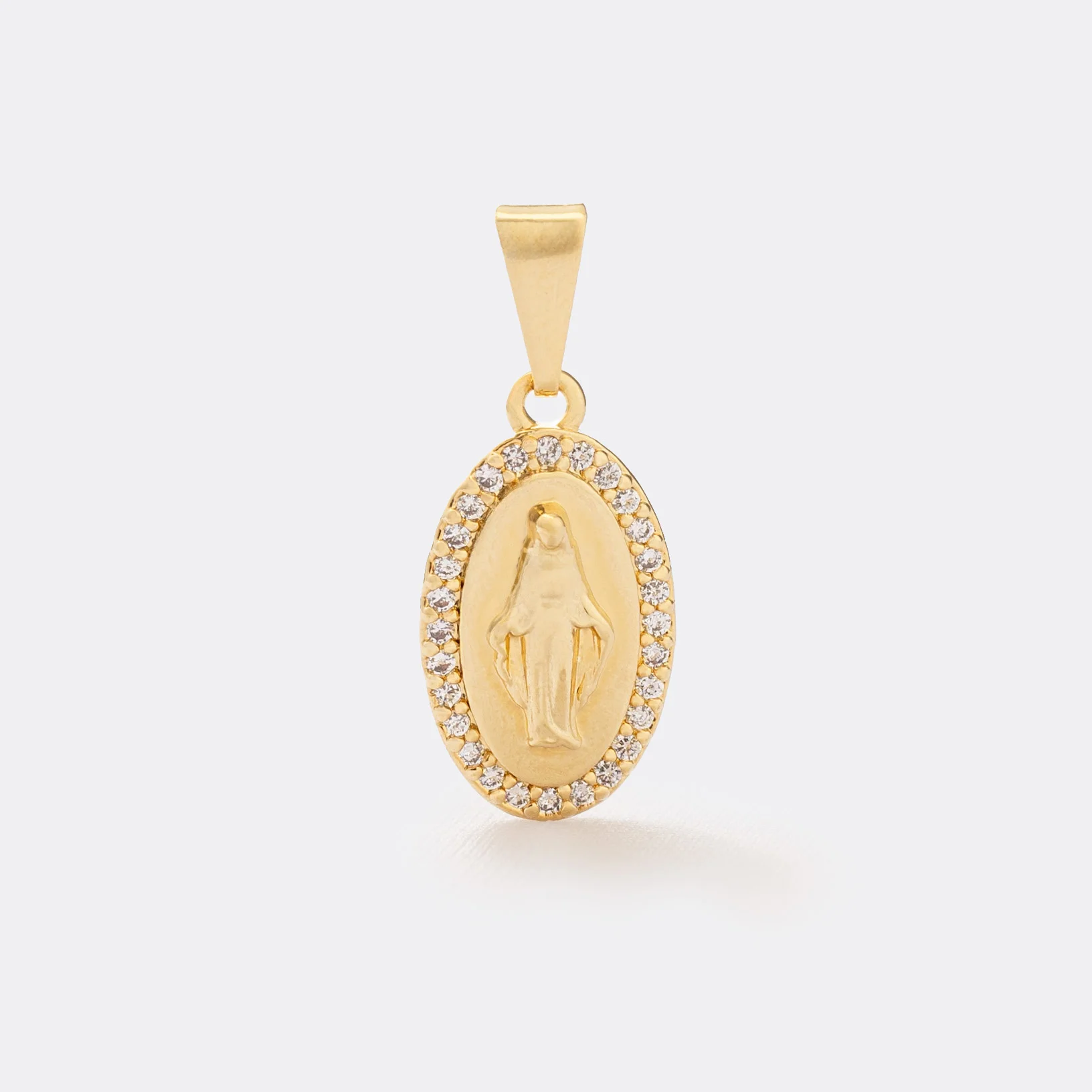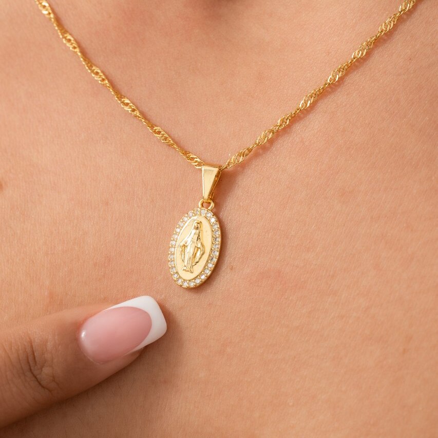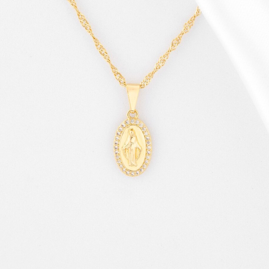 Este delicado dije en oro laminado 18K resalta la imagen de la Virgen Milagrosa, rodeada de circonias cristal que aportan un resplandor divino. Un símbolo de devoción y protección, perfecto para quienes buscan una joya especial con significado espiritual.